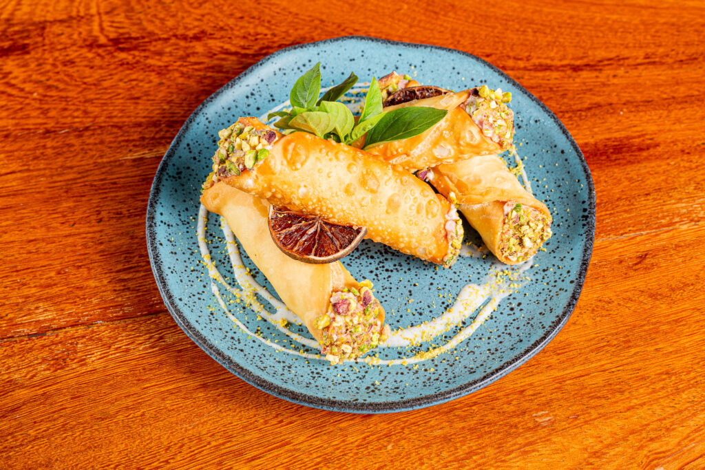 Alquimia | Canolli Bologna & Pistacchio com molho de limoncello: Canoli de massa crocante, recheado com mortadela Bologna, creme de catupiry e pistache, finalizado com toque cítrico de limoncello. Endereço: Rua Salvador Corrêa, 154.