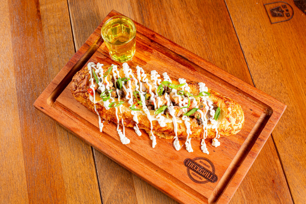 Deck Grill | Coração Valente: Pão de alho de massa própria com geleia de alho, vinagrete de banana, molho defumado e coração de galinha curtido no molho deck. Endereço: Avenida Pelinca, 350.