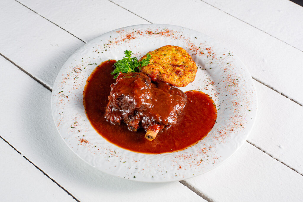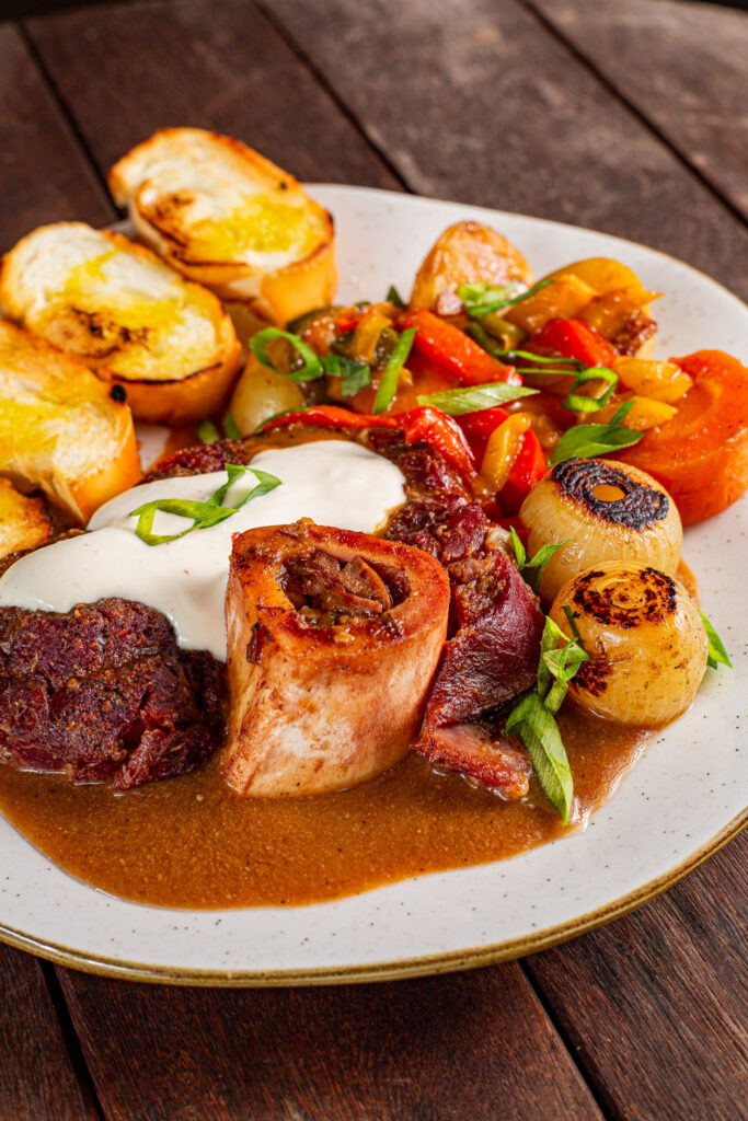 Diogo Coupey | Chambaril de vitrine: Ossobuco defumado por 6 horas em lenha de maçã e cozido lentamente com legumes, ervas e bacon, servido com sour cream e torradas. Endereço: Casarão – Rua Salvador Corrêa, 117.