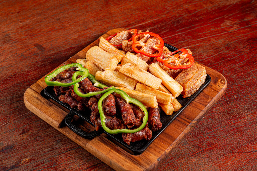 Fazenda São Bento | Mix Sertanejo: mix de linguiça mineira, torresmo e aipim com cobertura de queijo derretido, servidos na chapa. Endereço: RJ-216 – Santo Amaro