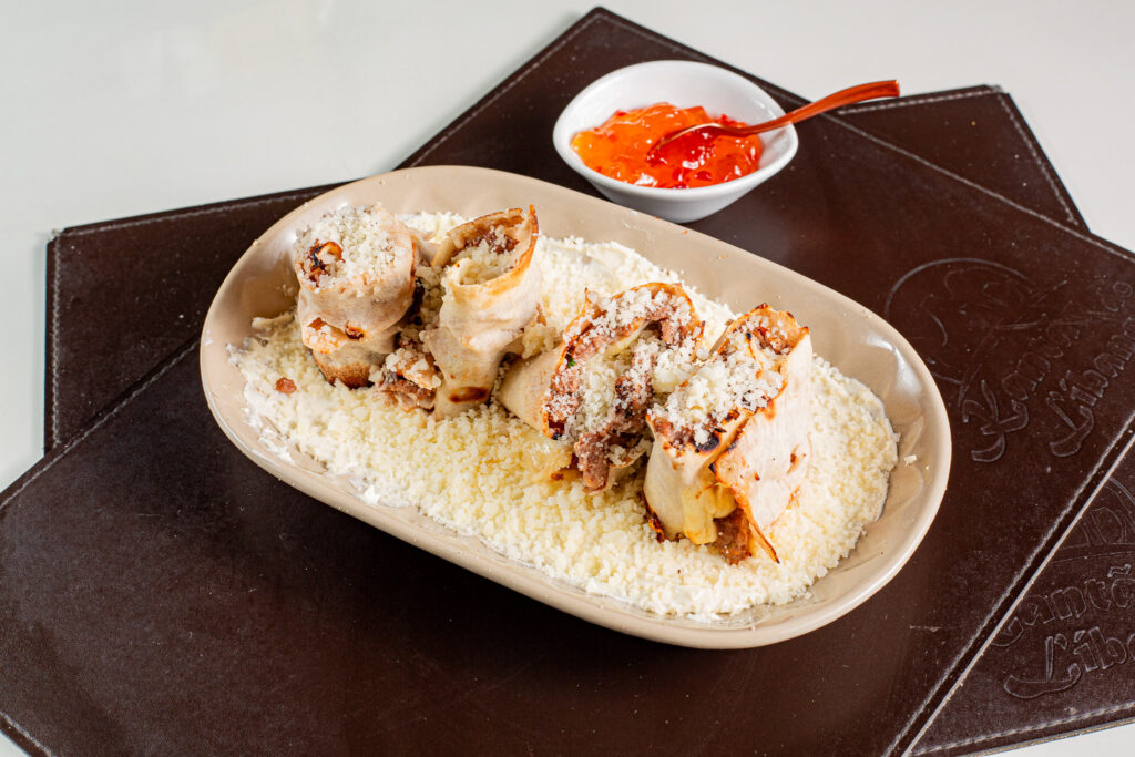 Kantão do Líbano | Kebab Rolo: Croquete de carne empanado na farinha panko, recheado com linguiça e queijo derretido. Acompanha molho de pimenta da casa e molho de goiabada.