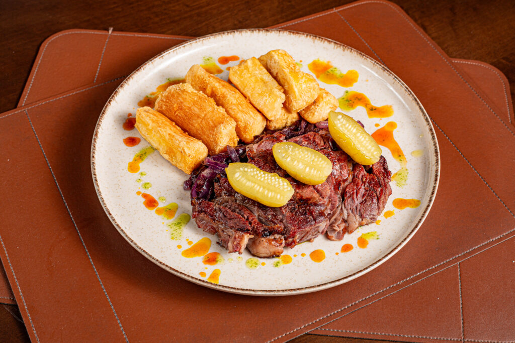 Meats | Raízes do Sertão: Carne de sol caicó assada na brasa, confit de cebola roxa, picles de maxixe, aipim frito e manteiga de garrafa. Endereço: Av. Pelinca, 384.