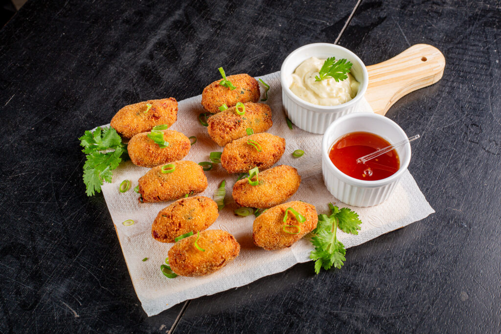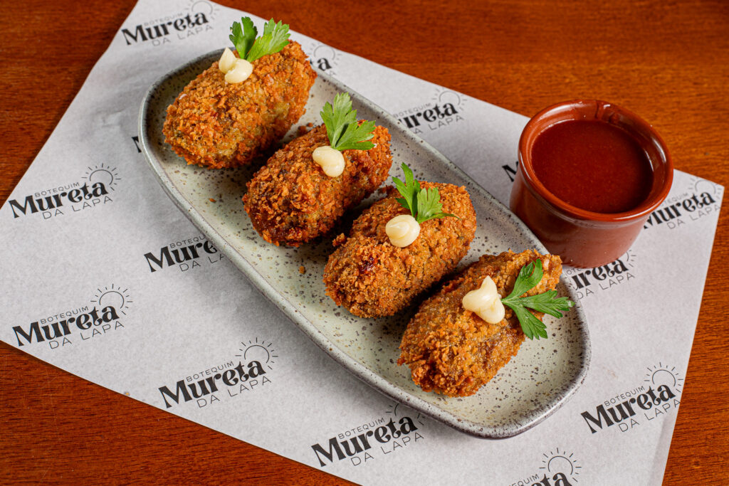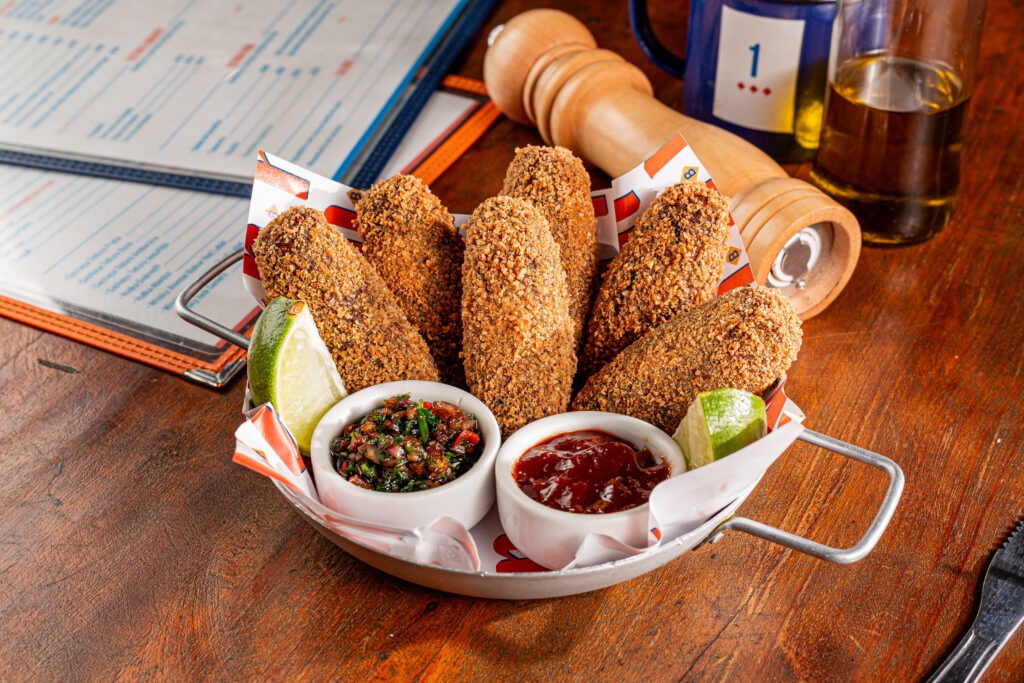 Nosso Botequim | Nosso croquete: croquete de carne empanado na farinha panko, recheado com linguiça e queijo derretido. Acompanha molho de pimenta da casa e molho de goiabada. Endereço: Rua Salvador Corrêa, 110 – Centro.