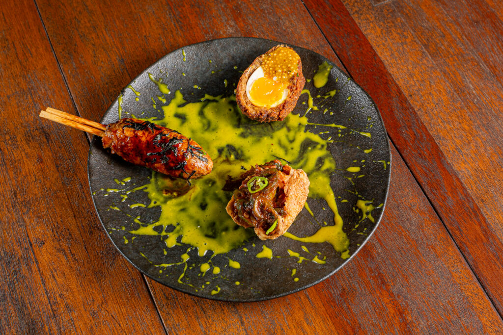 Nomad Smoke House | Marylou de Onde Vim Pra Onde Vou? Quem nasceu primeiro, o ovo ou a galinha?: Bolovo em crosta de costela com grãos de mostarda embebidos em cerveja e mel, seguido de cesto pururucado de galinhada e isca típica de bares japoneses (Isakaya), chamada Tsukune. Endereço: Rua João Sobral Bittencourt, 100.
