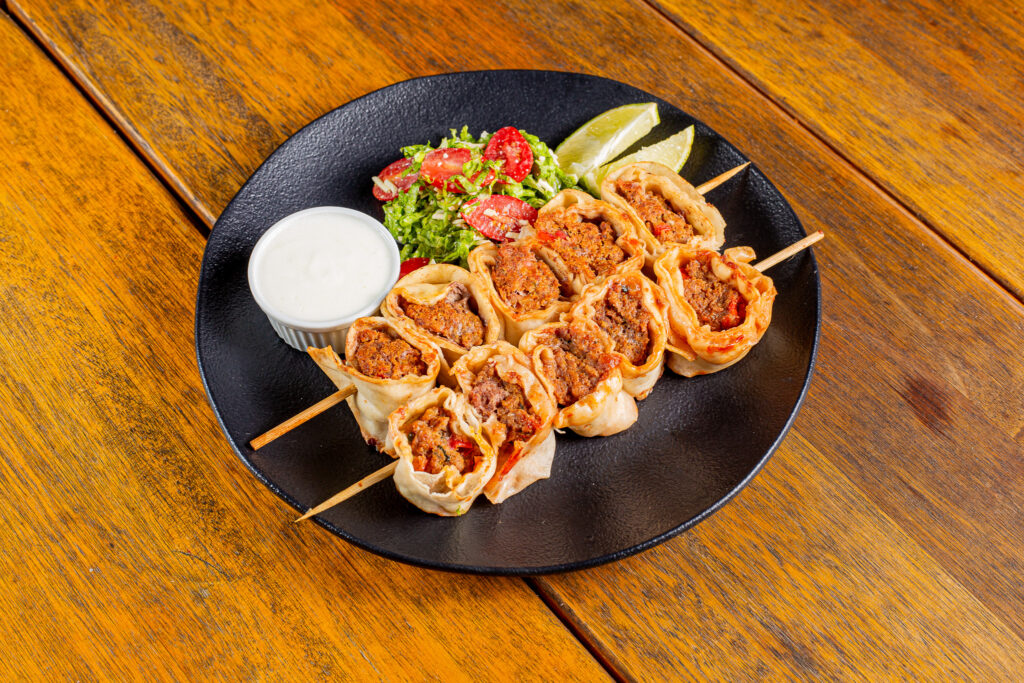 Seu Santo | Medalhão Árabe: Espetinho de kafta temperado envolto em fina casca artesanal, acompanha salada e molho de iogurte com limão. Endereço: Avenida Pelinca, 274.