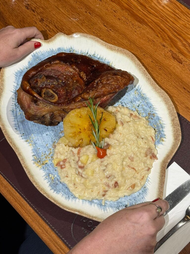 Outra novidade é o Eisbein, um prato típico da culinária alemã. Um clássico corte de joelho suíno defumado, macio e suculento, acompanhado de um delicioso risoto de parma e abacaxi grelhado. A crocância da pururuca é espetacular!