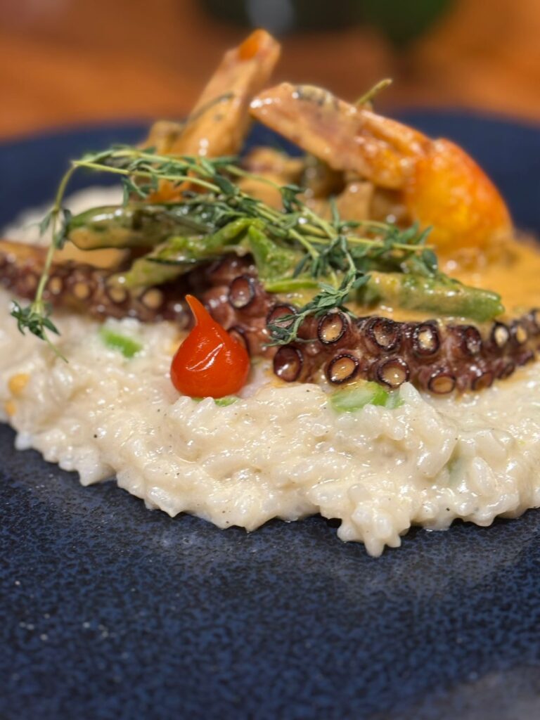Para os fãs de camarão, a novidade é o Duo Maré Alta, uma combinação de polvo e camarões VG grelhados, com risoto de aspargos ao molho de crustáceos. Um molho super rico de sabor, que amarra todo o prato.