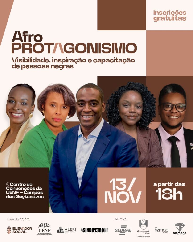 Nesta quinta (13), às 18h, o Centro de Convenções da Universidade Estadual do Norte Fluminense (UENF) recebe o evento AfroProtagonismo, organizado pelo projeto Elevador Social, que tem como propósito ampliar a equidade racial e fortalecer a presença de pessoas negras em posições de liderança no mercado de trabalho.
