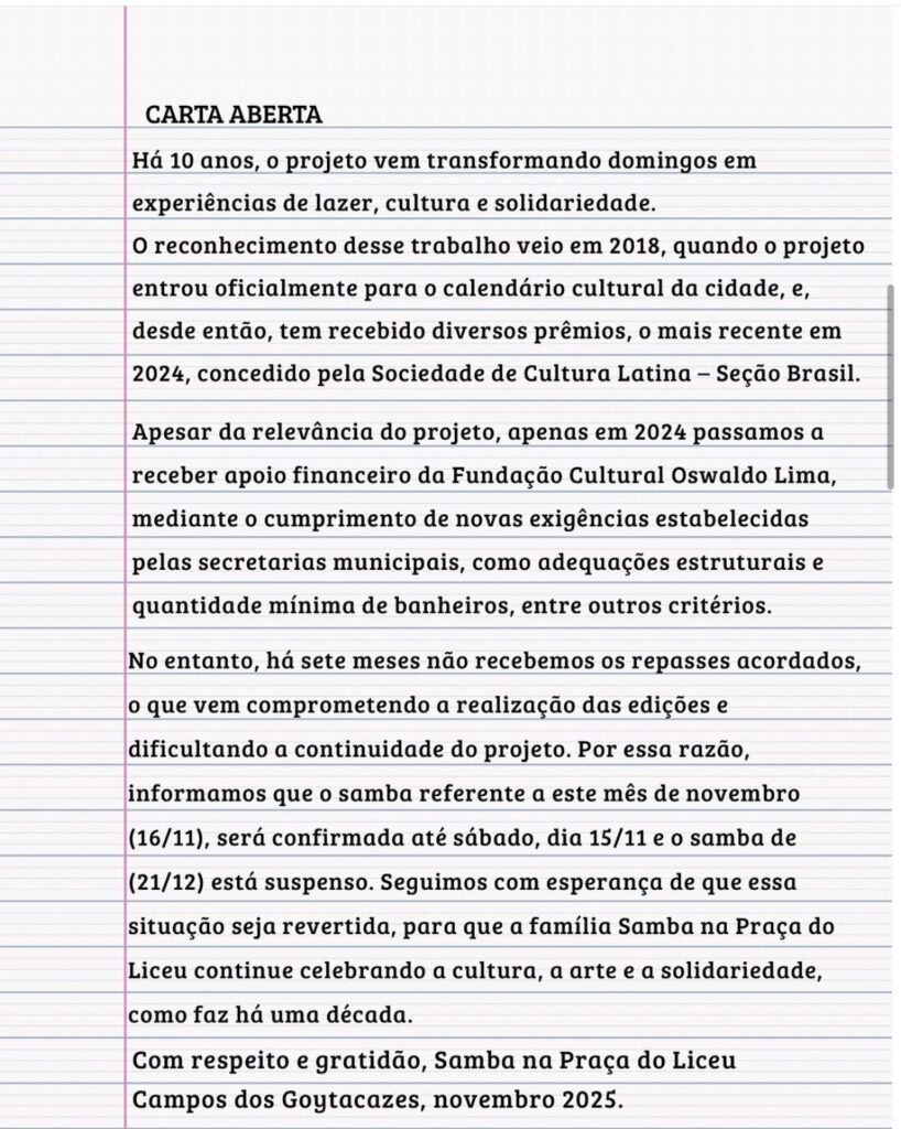 O já tradicional projeto Samba na Praça do Liceu emitiu uma carta informando que as próximas edições correm risco de não ocorrer devido a atrasos de sete meses de repasse do apoio financeiro que deveria ser feito pela Fundação Cultural Jornalista Oswaldo Lima.