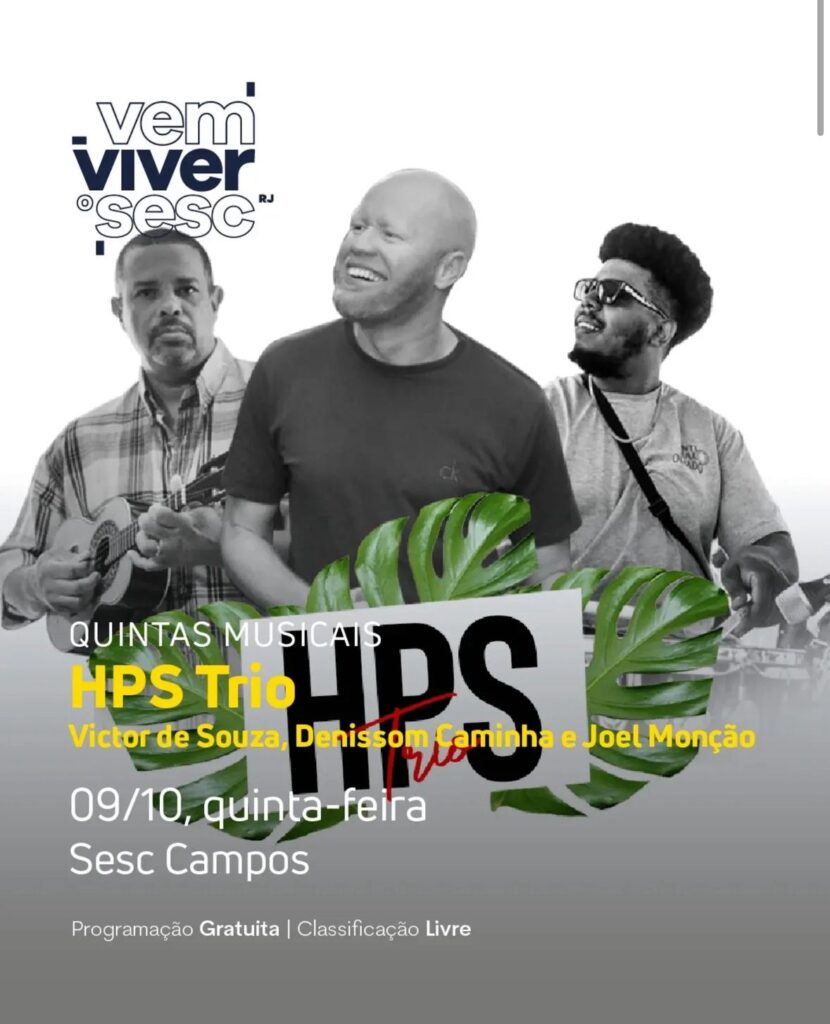 A cada quinta-feira, artistas da cena local ocupam o espaço com show em formato pocket, homenagens musicais e muita identidade. Nesta quinta (9), às 19h, é a vez do HPS Trio. Formado por Victor de Souza (voz e percussão), Denissom Caminha (bateria) e Joel Monção (violão e cavaquinho), o trio apresenta versões suaves e bem trabalhadas de sambas e canções brasileiras de compositores que circulam menos nos repertórios atuais, como Hermínio Bello de Carvalho, Aldir Blanc e Cartola.