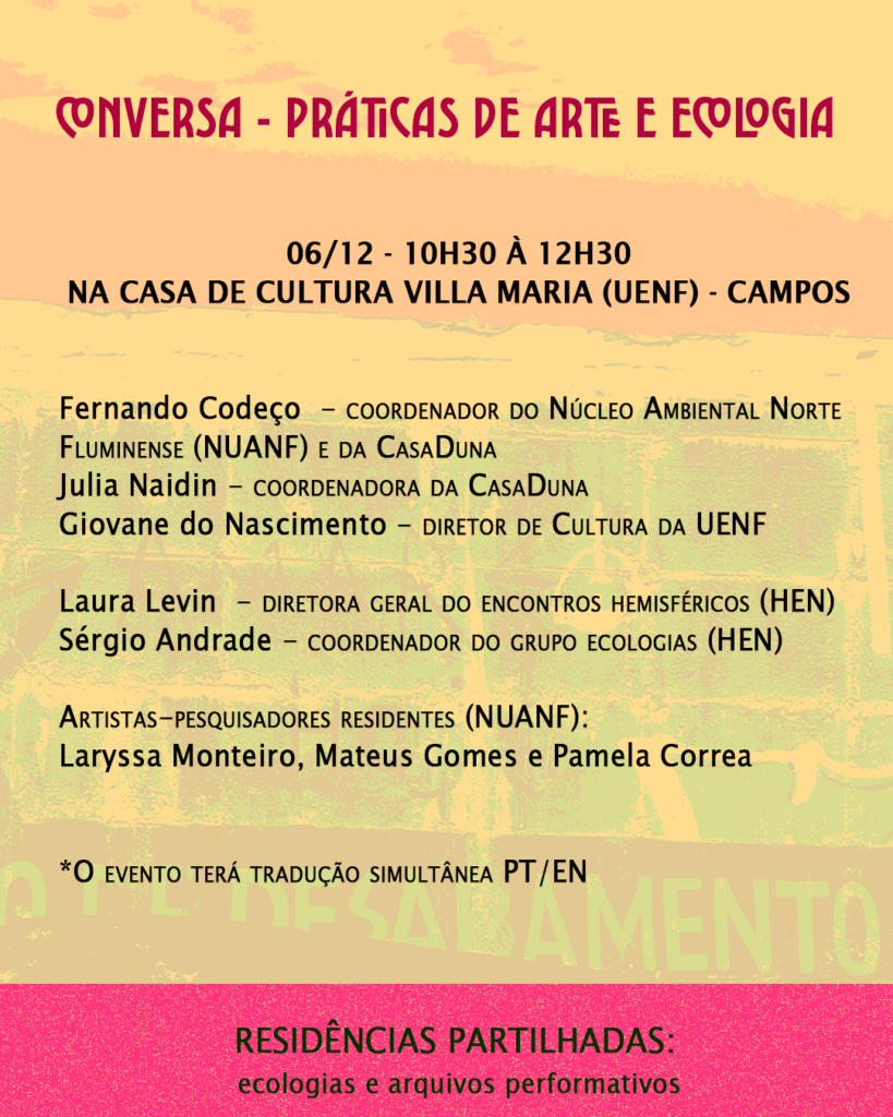 Entre os dias 4 e 6 de dezembro, o Núcleo Ambiental Norte Fluminense (NUANF), os Encontros Hemisféricos (HEN) e a CasaDuna, realizam, em Atafona e em Campos dos Goytacazes, “Residência Partilhada: ecologias e arquivos performativos”, reunindo 30 artistas e pesquisadores do Brasil e do exterior.