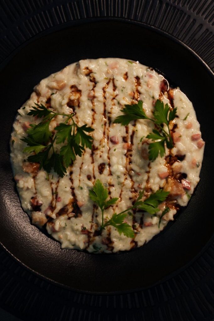 >Risoto de gorgonzola com bacon, abacaxi caramelizado e redução de aceto balsâmico;