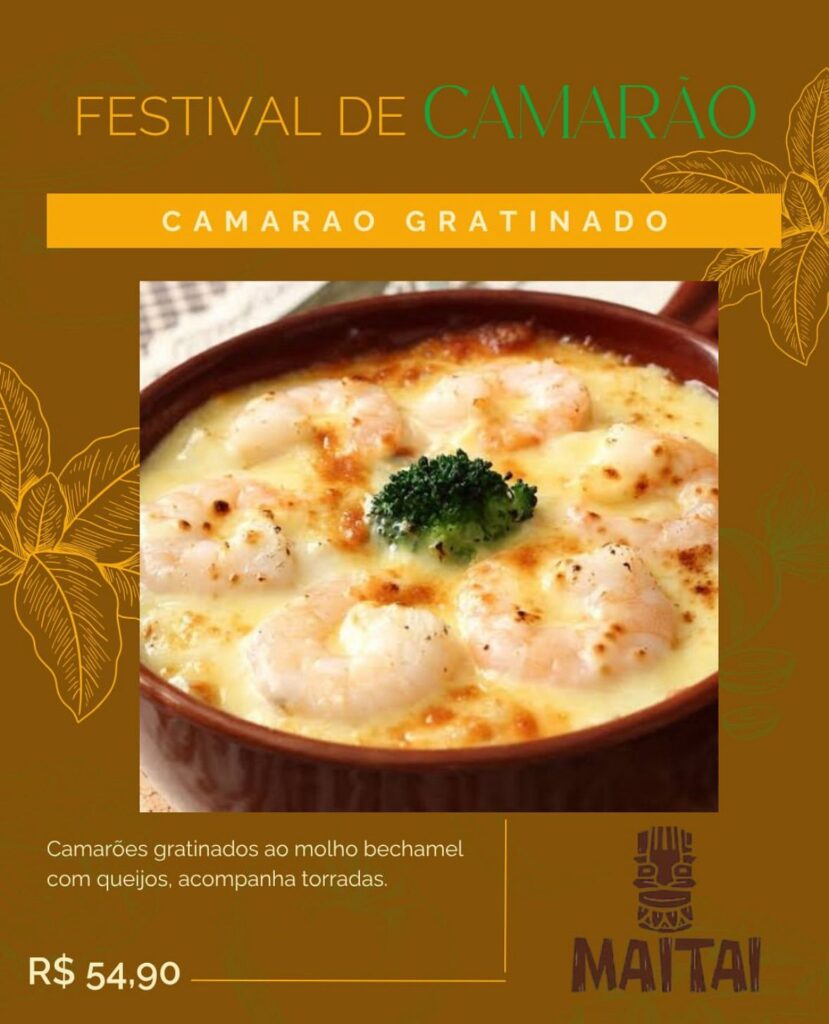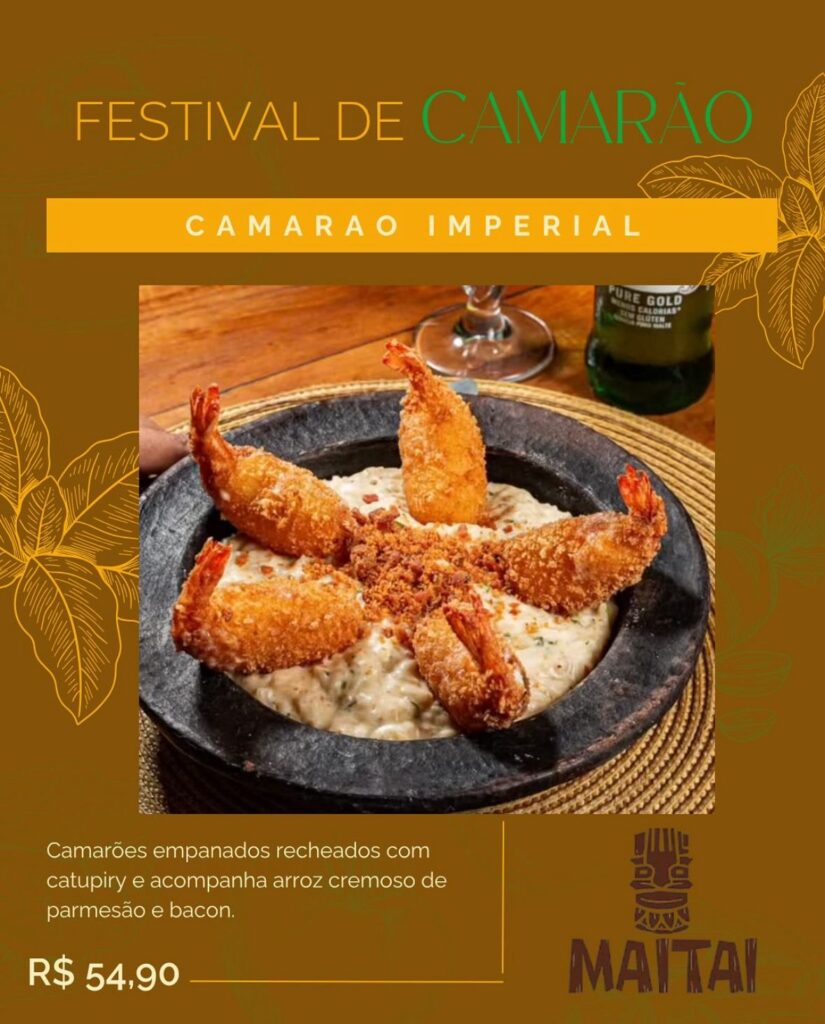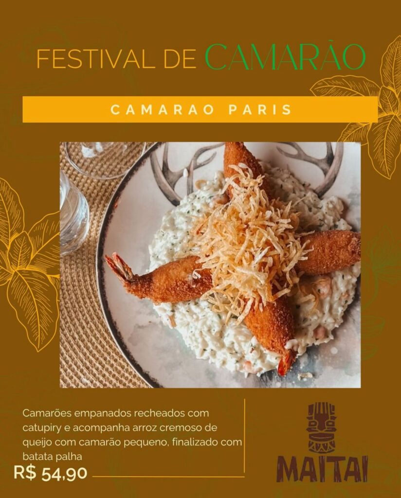O Restaurante Maitai, conhecido por sua culinária capixaba, realiza durante todo o mês de agosto o Festival do Camarão. São 3 pratos especiais com valor único de R$ 54,90.