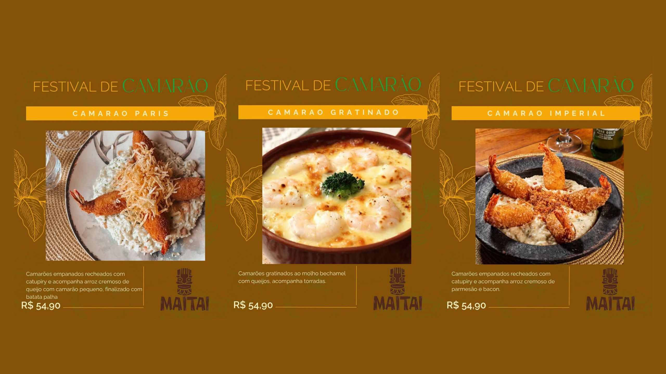 O Restaurante Maitai, conhecido por sua culinária capixaba, realiza durante todo o mês de agosto o Festival do Camarão. São 3 pratos especiais com valor único de R$ 54,90.